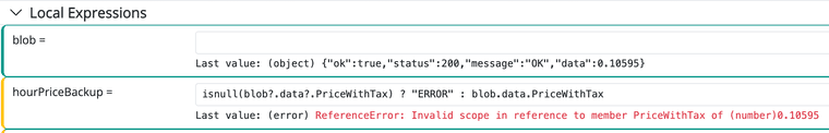 The expression "isnull(blob?.data?.PriceWithTax) ? \"ERROR\" : blob.data.PriceWithTax" in variable "hourPriceBackup" of rule "Get prices" (rule-m0bb80xn) failed evaluation