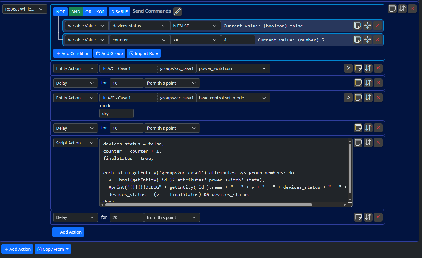 I have a couple of situation where I'm using code to iterate over an array (ie: climate entities, lights) to operate them in group, and repeat until every one has done what it needs to do.