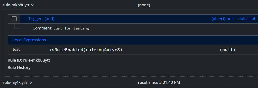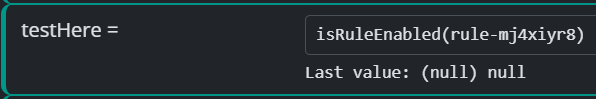 nullin both global and local expressions for the functionisRuleEnabled(). It doesn't matter if the rule is enabled or disabled. Let me know if you can't replicate and need logs at higher level or I'm doing something wrong.[latest-25325]2026-01-12T14:15:04.773Z <Rule:INFO> Laddning - Lastbalansering (rule-lj5kfvi6 in Funktioner) starting rule state evaluation; because timer-trigger Timer#rule-lj5kfvi6 [latest-25325]2026-01-12T14:15:07.348Z <Rule:NOTICE> rule-mkb8uytt (rule-mkb8uytt in Funktioner) configuration changed; reloading [latest-25325]2026-01-12T14:15:07.349Z <Engine:INFO> Engine#1 rule Rule#rule-mkb8uytt changed; reloading and restarting it [latest-25325]2026-01-12T14:15:07.349Z <Rule:NOTICE> rule-mkb8uytt (rule-mkb8uytt in Funktioner) stopping [latest-25325]2026-01-12T14:15:07.350Z <Rule:NOTICE> rule-mkb8uytt (rule-mkb8uytt in Funktioner) stopped [latest-25325]2026-01-12T14:15:07.350Z <Rule:NOTICE> rule-mkb8uytt (rule-mkb8uytt in Funktioner) starting [latest-25325]2026-01-12T14:15:07.350Z <Rule:NOTICE> rule-mkb8uytt (rule-mkb8uytt in Funktioner) can't start -- rule is disabled [latest-25325]2026-01-12T14:15:09.589Z <Rule:INFO> Ljusstyrka - Baksida (rule-kz3ygi32 in Ljusstyrka) starting rule state evaluation; because entity-changed Entity#mosquitto-mqtt>baksida [latest-25325]2026-01-12T14:15:09.772Z <Rule:INFO> Laddning - Lastbalansering (rule-lj5kfvi6 in Funktioner) starting rule state evaluation; because expression-state-changed GlobalExpression#chargeAmps [latest-25325]2026-01-12T14:15:09.773Z <Rule:INFO> Laddning - Återstarta om stoppad av lastbalansering (rule-m3yhrbvs in Funktioner) starting rule state evaluation; because expression-state-changed GlobalExpression#chargeAmps [latest-25325]2026-01-12T14:15:09.787Z <Rule:INFO> Laddning - Lastbalansering (rule-lj5kfvi6 in Funktioner) starting rule state evaluation; because timer-trigger Timer#rule-lj5kfvi6 [latest-25325]2026-01-12T14:15:10.024Z <Rule:INFO> Laddning - Ladda bil (rule-mgb4e7bl in Funktioner) starting rule state evaluation; because timer-trigger Timer#rule-mgb4e7bl [latest-25325]2026-01-12T14:15:10.025Z <Rule:INFO> Rule#rule-mgb4e7bl local values has_local_deps false has_object_deps true need_eval false [latest-25325]2026-01-12T14:15:10.025Z <Rule:INFO> Rule#rule-mgb4e7bl local title has_local_deps false has_object_deps true need_eval false [latest-25325]2026-01-12T14:15:10.025Z <Rule:INFO> Rule#rule-mgb4e7bl local text has_local_deps false has_object_deps true need_eval false [latest-25325]2026-01-12T14:15:10.025Z <Rule:INFO> Rule#rule-mgb4e7bl local chargingTime has_local_deps true has_object_deps false need_eval true [latest-25325]2026-01-12T14:15:10.025Z <Rule:INFO> Rule#rule-mgb4e7bl evaluating eligible local chargingTime [latest-25325]2026-01-12T14:15:10.025Z <Rule:INFO> Rule#rule-mgb4e7bl local currentValues has_local_deps true has_object_deps false need_eval true [latest-25325]2026-01-12T14:15:10.025Z <Rule:INFO> Rule#rule-mgb4e7bl evaluating eligible local currentValues [latest-25325]2026-01-12T14:15:10.746Z <Rule:INFO> Ljusstyrka - Badrummet (rule-m23jno54 in Ljusstyrka) starting rule state evaluation; because entity-changed Entity#mosquitto-mqtt>badrummet [latest-25325]2026-01-12T14:15:10.983Z <Rule:NOTICE> rule-mkb8uytt (rule-mkb8uytt in Funktioner) configuration changed; reloading [latest-25325]2026-01-12T14:15:10.984Z <Engine:INFO> Engine#1 rule Rule#rule-mkb8uytt changed; reloading and restarting it [latest-25325]2026-01-12T14:15:10.984Z <Rule:NOTICE> rule-mkb8uytt (rule-mkb8uytt in Funktioner) stopping [latest-25325]2026-01-12T14:15:10.985Z <Rule:NOTICE> rule-mkb8uytt (rule-mkb8uytt in Funktioner) stopped [latest-25325]2026-01-12T14:15:10.985Z <Rule:NOTICE> rule-mkb8uytt (rule-mkb8uytt in Funktioner) starting [latest-25325]2026-01-12T14:15:10.986Z <Rule:INFO> rule-mkb8uytt (rule-mkb8uytt in Funktioner) starting rule state evaluation; because startup [latest-25325]2026-01-12T14:15:10.986Z <Rule:INFO> Rule#rule-mkb8uytt initializing expressions: stage one - compile and dependency scan [latest-25325]2026-01-12T14:15:10.987Z <Rule:INFO> Rule#rule-mkb8uytt initializing expressions: stage two - topological sort [latest-25325]2026-01-12T14:15:10.987Z <Rule:INFO> Rule#rule-mkb8uytt initializing expressions: stage three - startup evaluation [latest-25325]2026-01-12T14:15:10.987Z <Rule:INFO> Rule#rule-mkb8uytt evaluating eligible local test [latest-25325]2026-01-12T14:15:10.989Z <Rule:INFO> rule-mkb8uytt (rule-mkb8uytt in Funktioner) started [latest-25325]2026-01-12T14:15:14.787Z <Rule:INFO> Laddning - Lastbalansering (rule-lj5kfvi6 in Funktioner) starting rule state evaluation; because timer-trigger Timer#rule-lj5kfvi6 [latest-25325]2026-01-12T14:15:15.026Z <Rule:INFO> Varmvattenberedare (rule-mgffrozr in Funktioner) starting rule state evaluation; because timer-trigger Timer#rule-mgffrozr -
