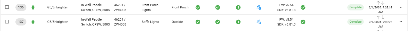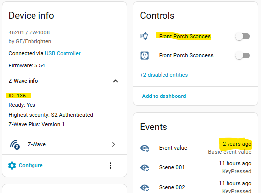 The device that is 136 is truly the Front Porch Sconces. Everywhere in the HA dashboards when I click on the binary switch, it does turn it on. Same with 137 being the Soffit Lights.
