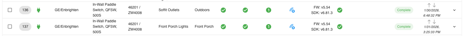 root@docker:/home/tmorgenthaler/reactor/logs# tail -f zwavejs.log | grep 137-0 [latest-26011]2026-01-31T20:25:01.008Z <ZWaveJSController:5:ZWaveJSController.js:1237> ZWaveJSController#zwavejs updating attribute power_switch.state with { "entity": "137-0", "impl": { "valueId": "37:currentValue:" } } [latest-26011]2026-01-31T20:25:01.008Z <ZWaveJSController:5:ZWaveJSController.js:1148> ZWaveJSController#zwavejs _apply_value entity Switch#zwavejs>137-0 power_switch.state [latest-26011]2026-01-31T20:25:01.008Z <ZWaveJSController:5:ZWaveJSController.js:1161> ZWaveJSController#zwavejs handling Switch#zwavejs>137-0 power_switch.state by { "valueId": "37:currentValue:" } with { "endpoint": 0, "commandClass": 37, "commandClassName": "Binary Switch", "property": "currentValue", "propertyName": "currentValue", "ccVersion": 2, "metadata": { "type": "boolean", "readable": true, "writeable": false, "label": "Current value", "stateful": true, "secret": false }, "value": true, "__endp": { "power_switch.state": { "entity": "137-0", "impl": { "valueId": "37:currentValue:" } } } } [latest-26011]2026-01-31T20:25:01.009Z <ZWaveJSController:5:ZWaveJSController.js:1252> ZWaveJSController#zwavejs setting Switch#zwavejs>137-0.x_zwave_values.Binary_Switch_currentValue to true [latest-26011]2026-01-31T20:25:01.104Z <ZWaveJSController:5:ZWaveJSController.js:948> ZWaveJSController#zwavejs handling node event statistics updated entity Switch#zwavejs>137-0 [latest-26011]2026-01-31T20:25:15.710Z <ZWaveJSController:INFO> ZWaveJSController#zwavejs performing power_switch.on on Front Porch Lights (Switch#zwavejs>137-0) with { } [latest-26011]2026-01-31T20:25:15.973Z <ZWaveJSController:5:ZWaveJSController.js:948> ZWaveJSController#zwavejs handling node event statistics updated entity Switch#zwavejs>137-0 [latest-26011]2026-01-31T20:25:16.125Z <ZWaveJSController:5:ZWaveJSController.js:948> ZWaveJSController#zwavejs handling node event value updated entity Switch#zwavejs>137-0 [latest-26011]2026-01-31T20:25:16.125Z <ZWaveJSController:5:ZWaveJSController.js:1252> ZWaveJSController#zwavejs setting Switch#zwavejs>137-0.x_zwave_values.Binary_Switch_targetValue to true [latest-26011]2026-01-31T20:25:16.125Z <ZWaveJSController:5:ZWaveJSController.js:948> ZWaveJSController#zwavejs handling node event value updated entity Switch#zwavejs>137-0 [latest-26011]2026-01-31T20:25:16.126Z <ZWaveJSController:5:ZWaveJSController.js:1237> ZWaveJSController#zwavejs updating attribute power_switch.state with { "entity": "137-0", "impl": { "valueId": "37:currentValue:" } } [latest-26011]2026-01-31T20:25:16.126Z <ZWaveJSController:5:ZWaveJSController.js:1148> ZWaveJSController#zwavejs _apply_value entity Switch#zwavejs>137-0 power_switch.state [latest-26011]2026-01-31T20:25:16.126Z <ZWaveJSController:5:ZWaveJSController.js:1161> ZWaveJSController#zwavejs handling Switch#zwavejs>137-0 power_switch.state by { "valueId": "37:currentValue:" } with { "endpoint": 0, "commandClass": 37, "commandClassName": "Binary Switch", "property": "currentValue", "propertyName": "currentValue", "ccVersion": 2, "metadata": { "type": "boolean", "readable": true, "writeable": false, "label": "Current value", "stateful": true, "secret": false }, "value": true, "__endp": { "power_switch.state": { "entity": "137-0", "impl": { "valueId": "37:currentValue:" } } } } [latest-26011]2026-01-31T20:25:16.126Z <ZWaveJSController:5:ZWaveJSController.js:1252> ZWaveJSController#zwavejs setting Switch#zwavejs>137-0.x_zwave_values.Binary_Switch_currentValue to true [latest-26011]2026-01-31T20:25:16.224Z <ZWaveJSController:5:ZWaveJSController.js:948> ZWaveJSController#zwavejs handling node event statistics updated entity Switch#zwavejs>137-0 [latest-26011]2026-01-31T20:25:33.510Z <ZWaveJSController:5:ZWaveJSController.js:948> ZWaveJSController#zwavejs handling node event statistics updated entity Switch#zwavejs>137-0 [latest-26011]2026-01-31T20:25:33.661Z <ZWaveJSController:5:ZWaveJSController.js:948> ZWaveJSController#zwavejs handling node event value updated entity Switch#zwavejs>137-0 [latest-26011]2026-01-31T20:25:33.661Z <ZWaveJSController:5:ZWaveJSController.js:948> ZWaveJSController#zwavejs handling node event value updated entity Switch#zwavejs>137-0 [latest-26011]2026-01-31T20:25:33.662Z <ZWaveJSController:5:ZWaveJSController.js:1252> ZWaveJSController#zwavejs setting Switch#zwavejs>137-0.x_zwave_values.Binary_Switch_targetValue to false [latest-26011]2026-01-31T20:25:33.666Z <ZWaveJSController:5:ZWaveJSController.js:1237> ZWaveJSController#zwavejs updating attribute power_switch.state with { "entity": "137-0", "impl": { "valueId": "37:currentValue:" } } [latest-26011]2026-01-31T20:25:33.666Z <ZWaveJSController:5:ZWaveJSController.js:1148> ZWaveJSController#zwavejs _apply_value entity Switch#zwavejs>137-0 power_switch.state [latest-26011]2026-01-31T20:25:33.666Z <ZWaveJSController:5:ZWaveJSController.js:1161> ZWaveJSController#zwavejs handling Switch#zwavejs>137-0 power_switch.state by { "valueId": "37:currentValue:" } with { "endpoint": 0, "commandClass": 37, "commandClassName": "Binary Switch", "property": "currentValue", "propertyName": "currentValue", "ccVersion": 2, "metadata": { "type": "boolean", "readable": true, "writeable": false, "label": "Current value", "stateful": true, "secret": false }, "value": false, "__endp": { "power_switch.state": { "entity": "137-0", "impl": { "valueId": "37:currentValue:" } } } } [latest-26011]2026-01-31T20:25:33.666Z <ZWaveJSController:5:ZWaveJSController.js:1252> ZWaveJSController#zwavejs setting Switch#zwavejs>137-0.x_zwave_values.Binary_Switch_currentValue to false [latest-26011]2026-01-31T20:25:33.760Z <ZWaveJSController:5:ZWaveJSController.js:948> ZWaveJSController#zwavejs handling node event statistics updated entity Switch#zwavejs>137-0I also see the results of turning off the device from HAAS in the ZWaveJS logs.