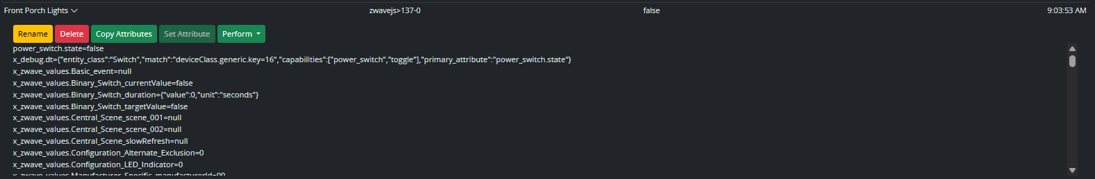 You've shown here all stuff from ZWaveController, not HassController...? I don't think that would be helpful here anyway, because it would only show the HA entity IDs, and HA doesn't embed ZWave node numbers in their entity names. You would have to go look at the device in HA to confirm the node numbers. In HA's UI, go to Settings > Integrations > ZWave > Devices. Find the device you think is your Front Porch Lights switch, and click it. In the Device Info area, there's a Z-Wave Info heading with an arrow — click the arrow to expose the node number.