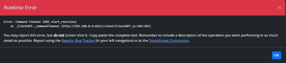 The current IP value in the Global Expression "myIP" is also wrong and not up to date. If I press the Play button on the Set Reaction I get this error: